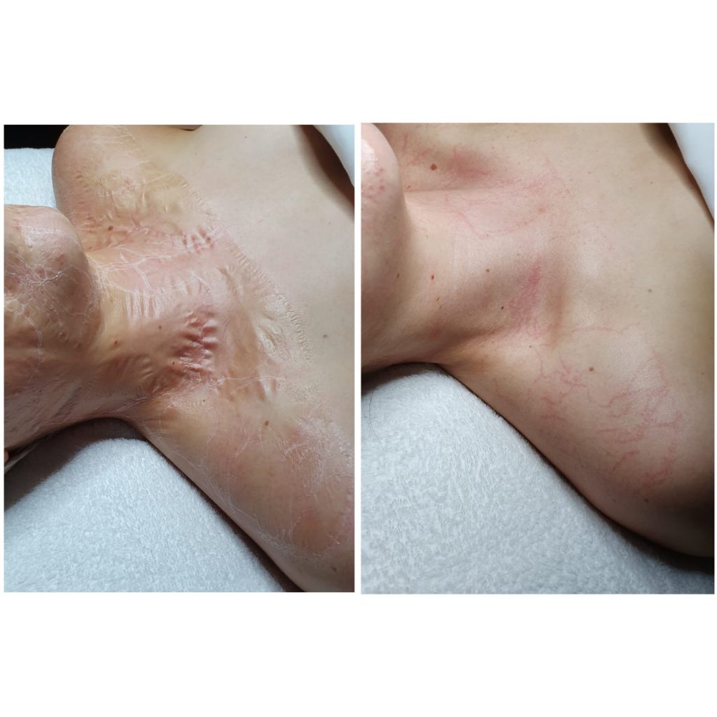 The enzyme mask is a mild chemical peel that comes in powder form and mixed using a 1:1 ratio of powder and water, it’s mixed to a bubbly consistency and brushed over the face. Enzymes work by ridding the skin of dead skin cells, therefore giving a deep exfoliation. Enzymes are perfect for sensitive skins.